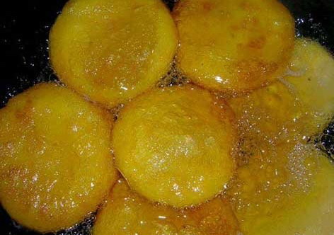 8. 锅中放油烧到八成热,放入饼用中火炸8分钟(炸的过程中要时时将饼翻面)。