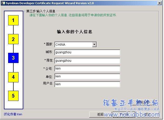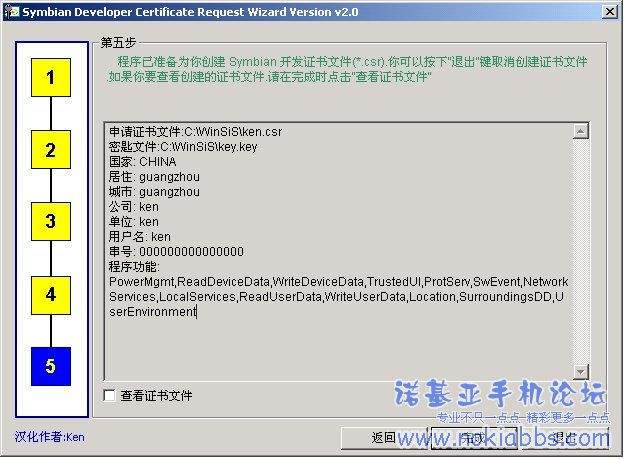 打开程序第三步骤安装的程序. (一):输入或选择输出文件路径和文件名 附件 16035 然后选择"下一步" (二):选择你的密匙文件 如果你有ACS密匙文件.请在ACS证书选择"是".利用此证书可以制作无限制串号的 SIS .也就是通用的程序.无需再一个一个串号sign 我上传的key无密码所以不需要输入密码 下载附件 1.key文件 附件 16037 然后选择"下一步" (三):输入你的个人信息,这一步可随便输入 附件 16038 (四):输入你的手机串号 在第四步中先点击右边的按钮.在弹出的对话框内按下图输入你的手机串号,待机状态下输入*#06#可得 附件 16039 然后选择"确定".在回到第四步中.点击"增加"按钮.把左列表中的全部功能增加到右列表. 然后选择"下一步" (四):确认申请信息 附件 16040 确定所输入的信息无误后.点击"完成"按钮.最后会提示已成功创建文件.文件后缀为csr |